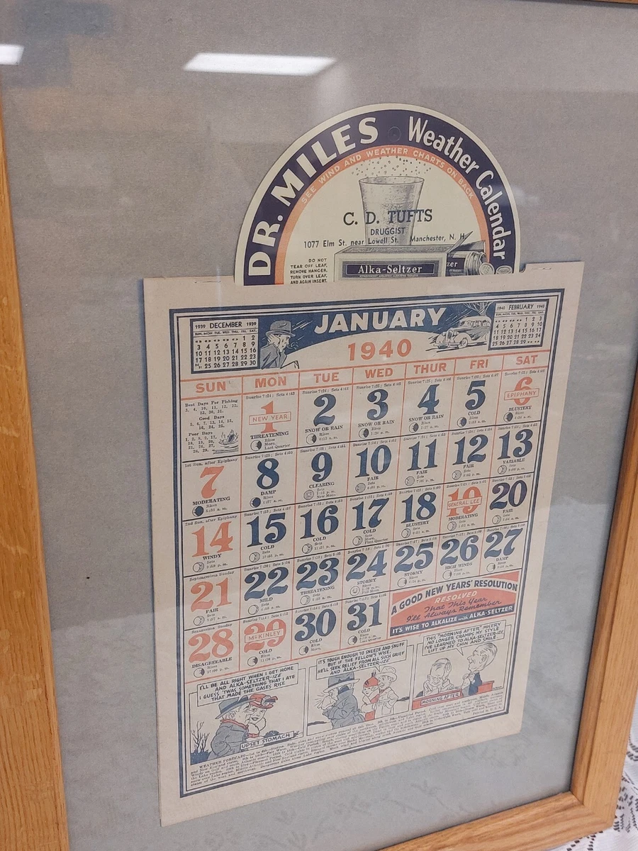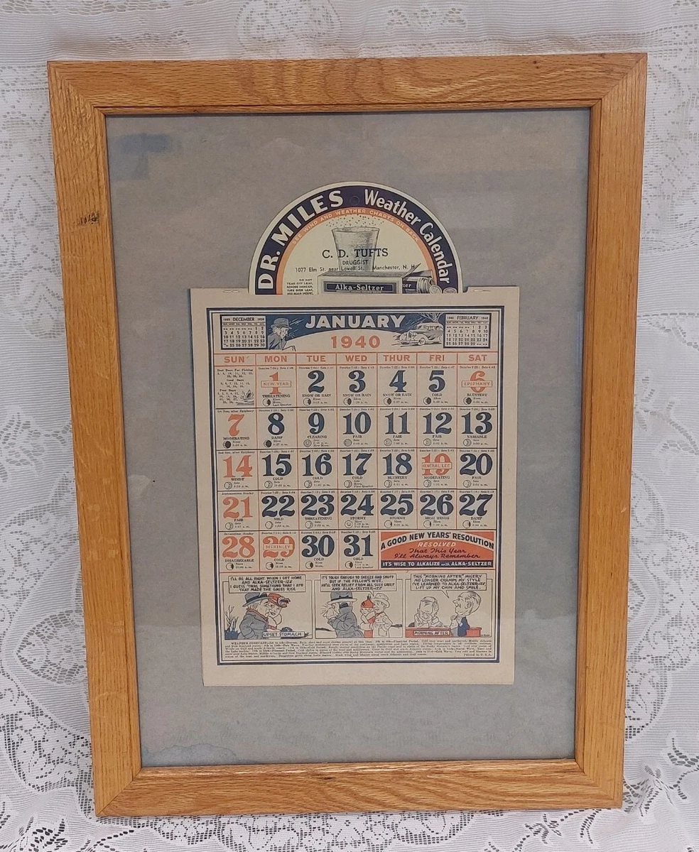Vtg framed Calendar 1940 MILES Weather Calendar, Tufts Druggist